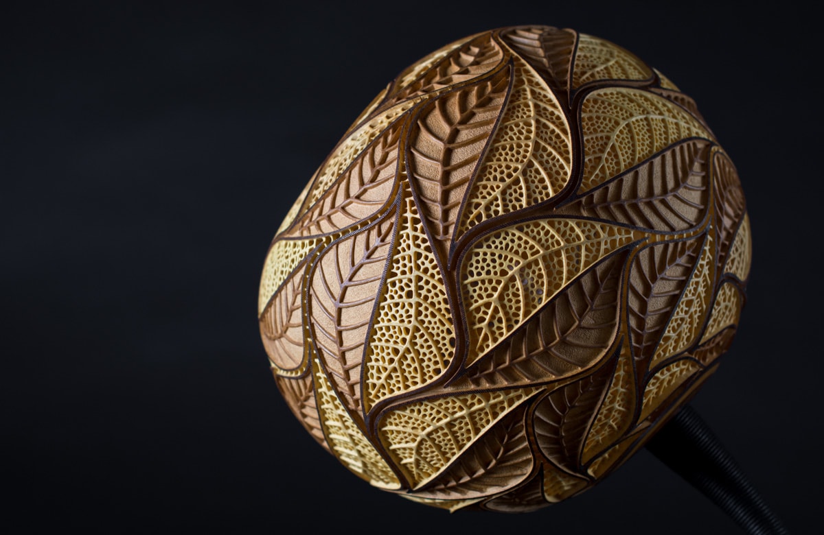Although perforation of most of my lamps is drilled, in case of the Escher’s Leaves the whole gourd is carved, including the openwork leaves which structure is based upon the Voronoi diagram.